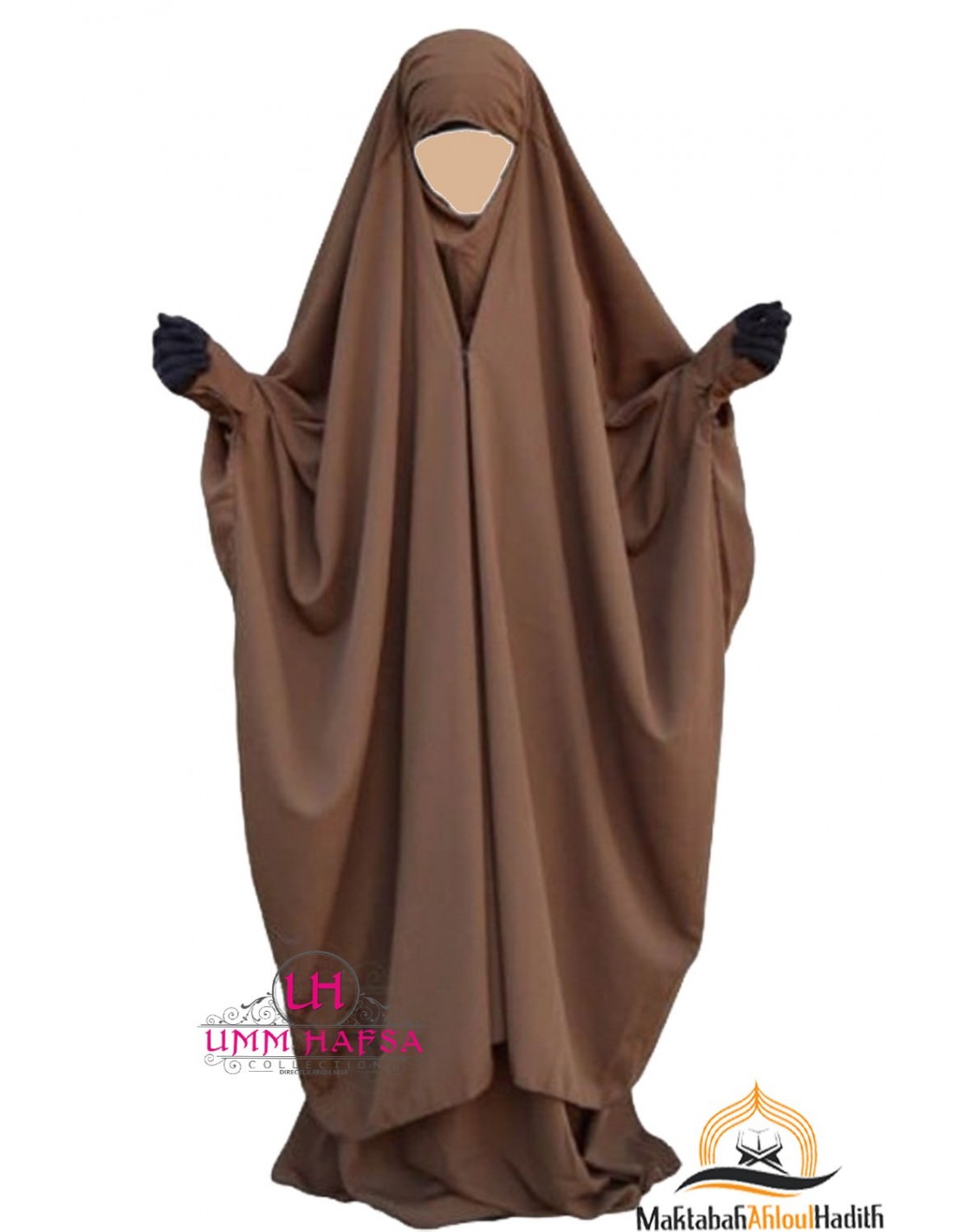 Dieser Jilbab besteht aus einem ausgestellten Rock sowie einem 1,85 m breiten und sehr bedeckenden Umhang mit Clips . Er hat einen Kinnschutz und ein integriertes Stirnband.