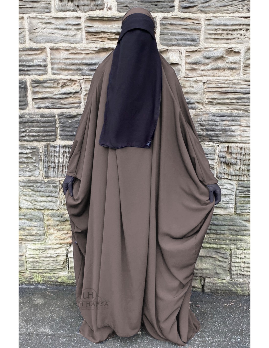 Aus dem ägyptischen Whool pech-Stoff genäht. Dieser Umm Hafsa Jilbab ist blickdicht und fließend.