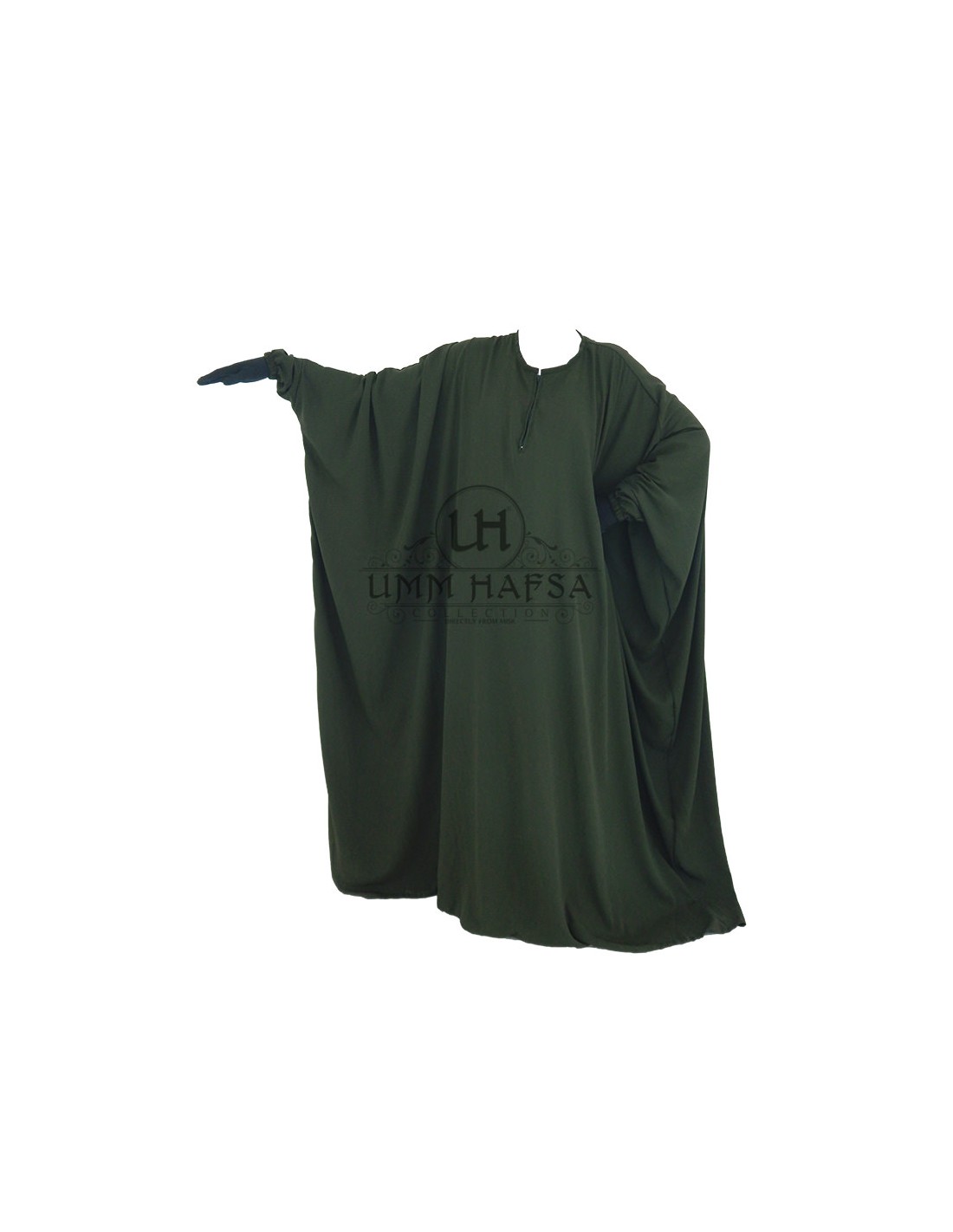The Umm Hafsa abaya is a very pretty and particularly mastour model: a butterfly cut, a width of 1m85, tightened sleeves and a rounded collar with a closure that allows mothers to breastfeed in all modesty.
