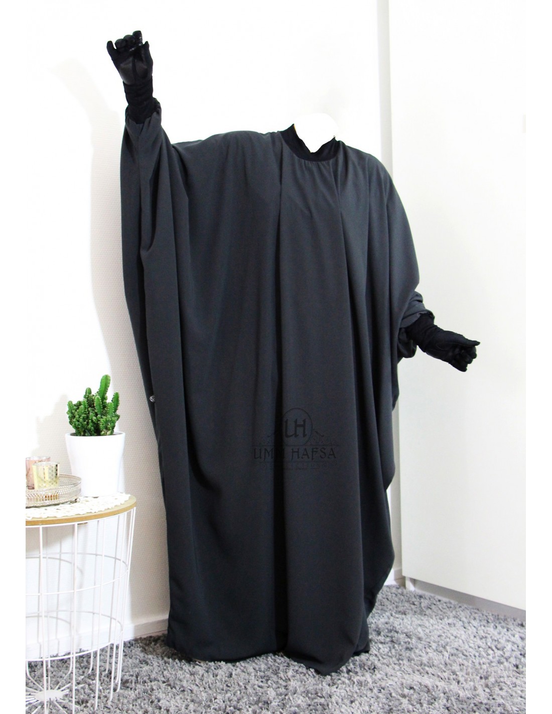 Un corte de mariposa ancho que oculta tus curvas y te cubre, la abaya está ligeramente recortada en los laterales para evitar que arrastre por el suelo y se pise.