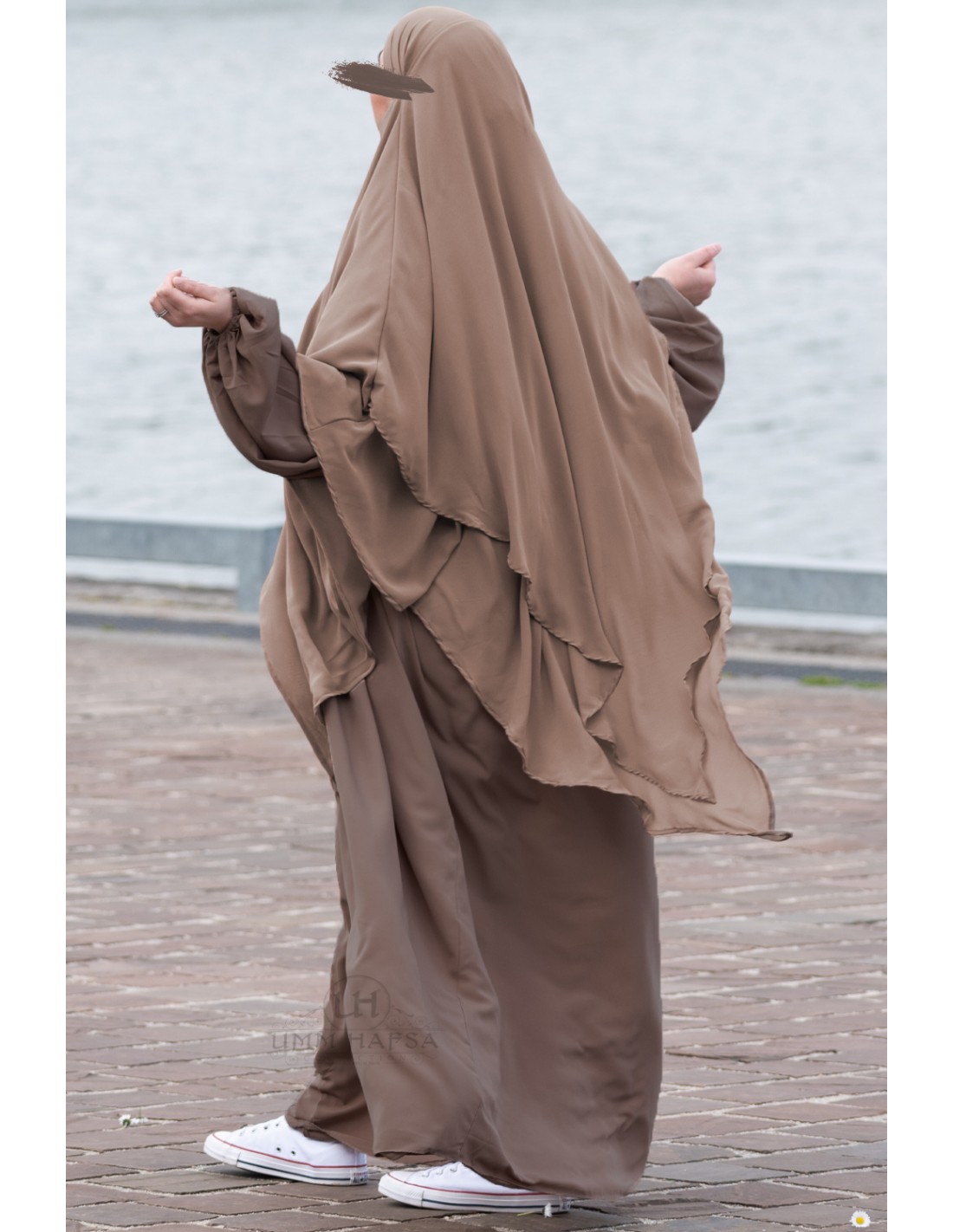 Astucieux : La abaya a été légèrement raccourcie sur les côtés afin d'éviter qu'elle ne traîne par terre.