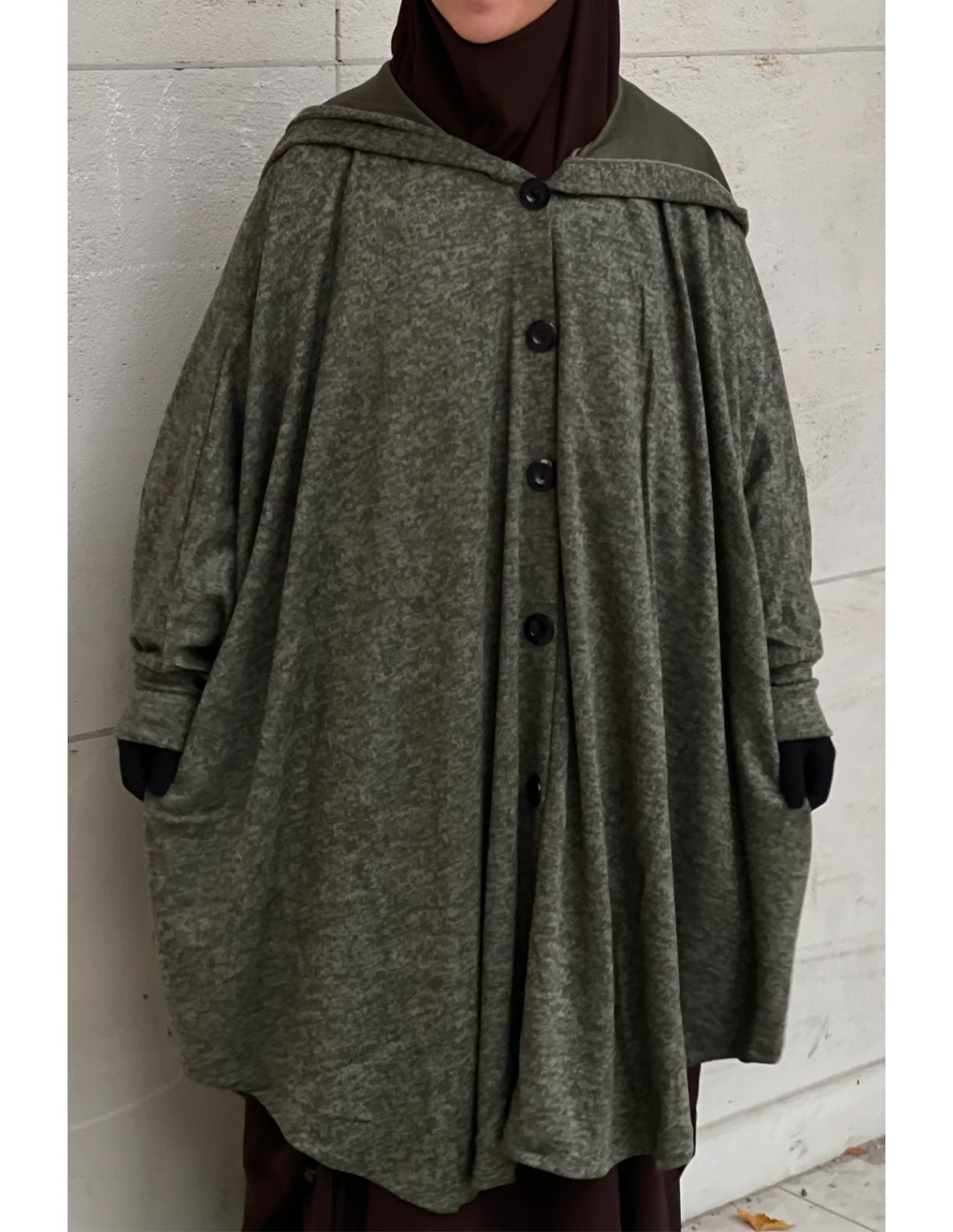è abbottonato e dotato di cappuccio per garantire calore e comfort.